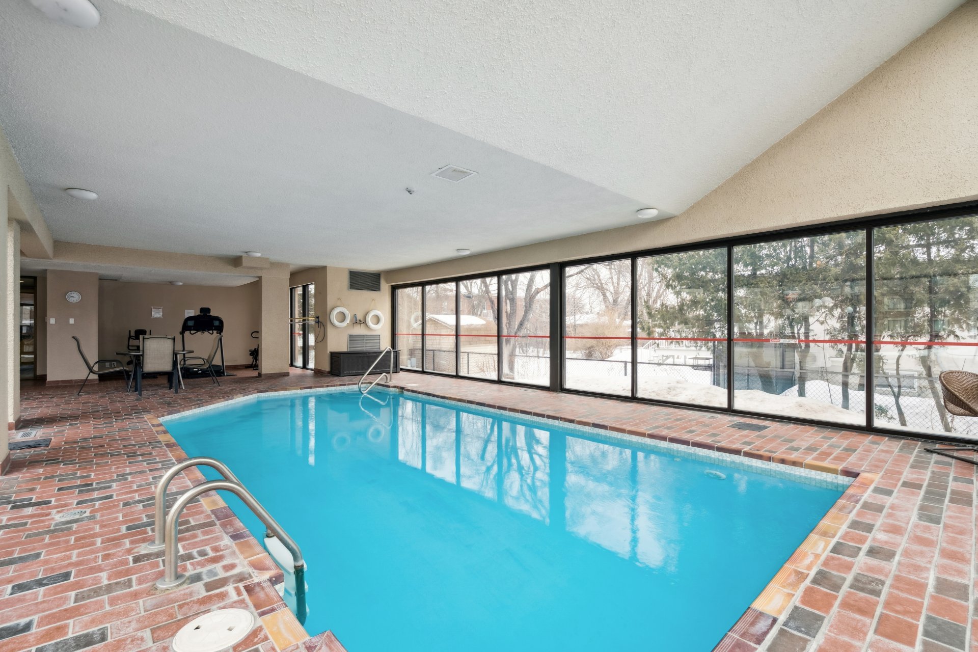 une piscine intérieure et un espace commun convivial.